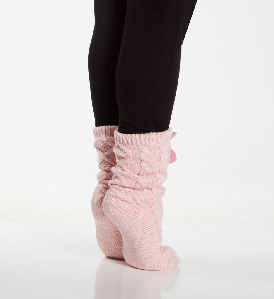 Cozy fleece lined slipper crew socks pom red cardy/cable knit.